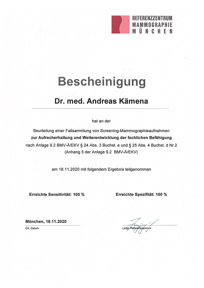 Dr. Kämena ist Mitglied der Deutschen Röntgengesellschaft, der Deutschen Gesellschaft für Senologie und weiterer Fachgesellschaften. In unabhängigen Patientenbewertungen zählt er seit vielen Jahren zu den bestbewerteten Radiologen der Region und wurde mehrfach mit dem FOCUS-Siegel „Empfohlene Ärzte in der Region“ ausgezeichnet.